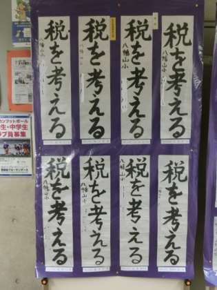「税を考える週間」小学生書道作品展に出品した作品を、1階の廊下に掲示しました。入選した児童の作品も展示されています。学校にお立ち寄りの際には、ぜひご覧ください。