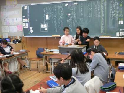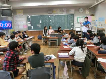 2組の5校時は学級活動です。今日の議題は、学期末に行うお楽しみ会で、みんなでやることを話し合いました。司会の説明をよく聞いて、1人1回考えて発言します。友達同士で声をかけ合いながら、話し合いが円滑に進むように協力していました。最後に担任の小林先生から、今日の話し合いについての講評があり、子どもたちのよい発言や声かけなどを取り上げて紹介していました。楽しいお楽しみ会になるといいですね。