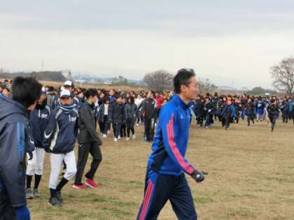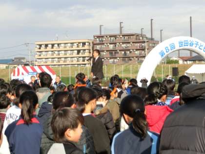 開会式では、世田谷区長さんからの激励の言葉をいただきました。式の後、マラソン男子の元日本記録保持者で、東京国際マラソン優勝経験をもつ 高岡寿成さんの指導の下、全体でのウォーミングアップが行われました。