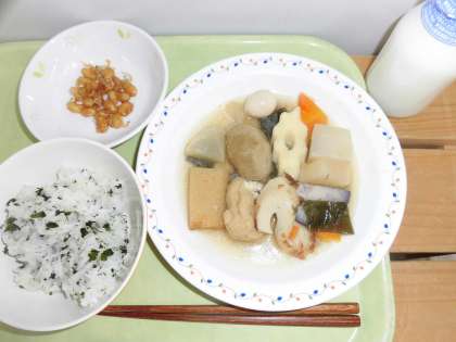 「わかめごはん、おでん、大豆とじゃこの甘辛揚げ、牛乳」です。