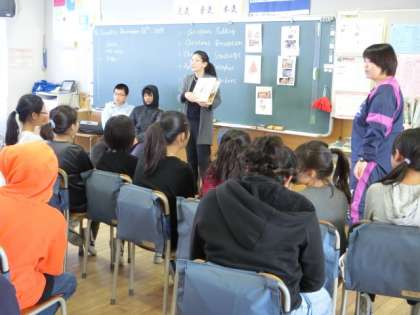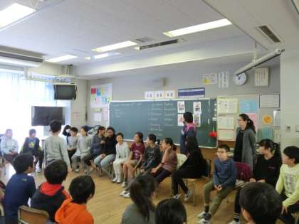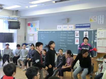 2組の3時間目は外国語活動です。今日も英語支援員の先生に加わっていただき、楽しく英語を勉強します。英語を使ったフルーツバスケットでは、クリスマスにちなんだワードを使って、大いに盛り上がっていました。支援員の先生の発音を聞いて、しっかり英語のイントネーションにも慣れてきました。