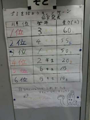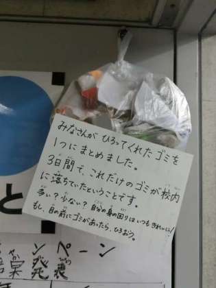 代表委員会が企画した「ゴミを拾おうキャンペーン」の結果報告が、1階の昇降口に掲示されました。わずか3日間の活動で、ポリ袋がいっぱいになっていました。みんなが意識してゴミを拾うことで、気持ちよく学校生活が送れることに気づいたと思います。まずはゴミを出さない、落ちていたら拾って捨てる意識を大事にしていきましょうね。