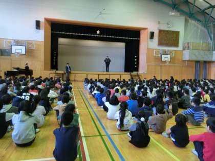 終業式の後は、冬休みの生活について、今日は八幡山駐在所の武藤巡査部長さんにご来校いただき、交通安全についてお話していただきました。さらに、生活指導主任の大石先生からも、生活のきまりについての確認がありました。