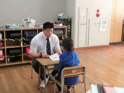 終了式の後、各教室では担任の先生から通信表が渡されました。先生たちは、子どもたち一人ひとりにメッセージを伝えながら、この2学期をいっしょに振り返っていました。