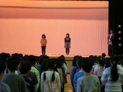 校長先生からは、お正月に行われた箱根駅伝で活躍した選手のことを話題に、短い3学期、自分の目標をしっかり立てて、進学・進級に向けての勉強や運動に励みましょうとの話がありました。児童代表の言葉は、2年生と6年生の女子がそれぞれの決意をしっかりと述べてくれました。みんな気持ちも新たに、3学期のスタートが切れたようです。