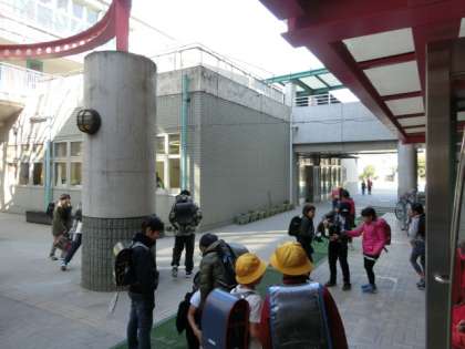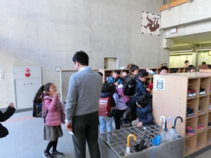 今日は給食なしの4時間授業で、全学年が下校となりました。昇降口まで先生が見送り、子どもたちが帰っていきます。明日から給食も始まります。風邪をひかないように、お家に帰ったら手洗い・うがいをして、また明日元気に登校して来てください。