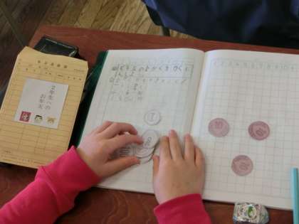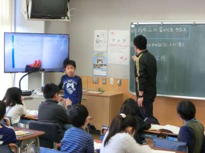 2組の2時間目は算数の授業で、「10000までの数」の学習で、お年玉を数える学習課題に取り組みました。先生から一人ひとりに配られたお年玉のお金を、どうやって数えるかについて考えます。袋の中に入っているお金を楽しそうに並べながら、自分の考えを発表していました。