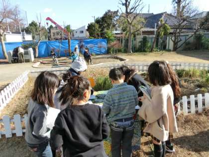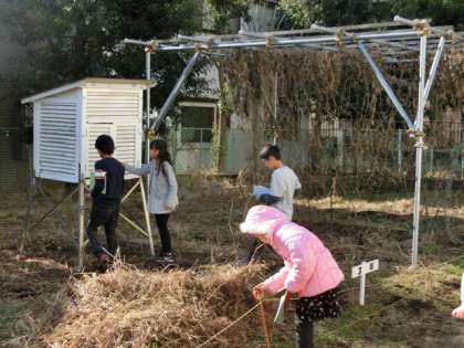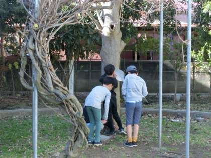 1組は屋外んでの理科の授業です。「磁石のひみつ」の単元の学習で、磁石にくっつくものを探しました。友達同士で相談しながら、学級園にあるもので認していきます。どんな素材が磁石に反応するかを自分の手で調べることで、学習内容の定着が進みます。暖かな日射しの下で、子どもたちは楽しそうに活動に取り組んでいました。