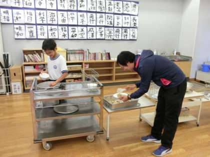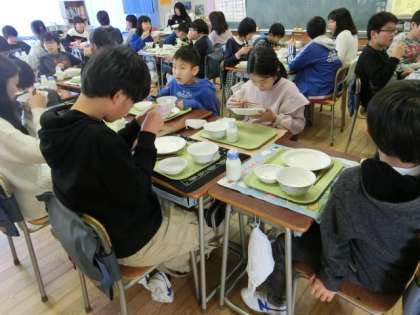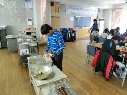 3学期の給食が始まりました。食べ盛りの高学年は、おかわりをしっかりして、今日も残さず食べてくれました。久しぶりにみんなで食べる給食です。楽しく会食する様子もうかがえました。