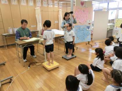 今日は1年生で発育測定が行われました。この1年間で、1年生も身長がぐんぐんと伸びて、どの子も4月の頃よりも成長していることがうかがえました。