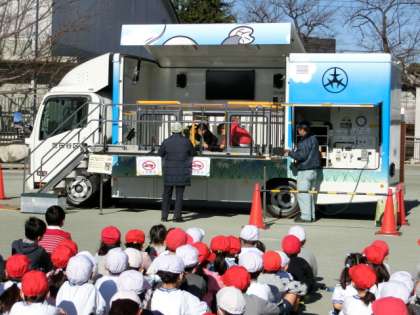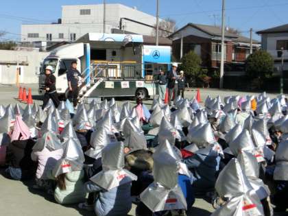 3学期最初の避難訓練も、先月に引き続き予告なしで行われました。地震が発生したという想定で、全児童が「お・か・し・も」の約束を守って、校庭に無事避難できました。避難後は、烏山総合支所地域振興課のご協力をいただき、起震車体験のデモンストレーションを行っていただきました。