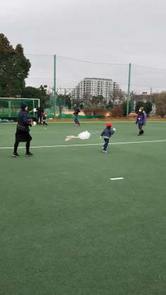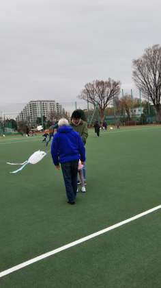 遊ぼうデーの年少組の前半は、明大グランドでたこ揚げでした。寒い中でしたが、元気いっぱいビニール袋たこを揚げました。上北沢町会長の新井さんにも、お手伝い頂きました。