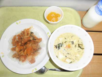 「豚キムチ丼、卵とわかめのスープ、杏仁豆腐、牛乳」です。