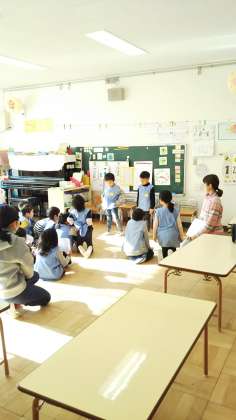 八幡山幼稚園の朝の年長組さんの様子です。今日は、1月の誕生会があるので、司会や歌の練習をしていました。