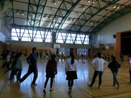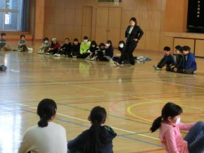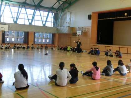 いつもはクラス単位で行っている外国語活動のモジュール授業ですが、今朝は5年生が体育館で合同の授業を行いました。英語の歌に合わせて身振り・手振りに、踊りながらの楽しい活動になりました。たまには、こんな取り組みも楽しいですね。