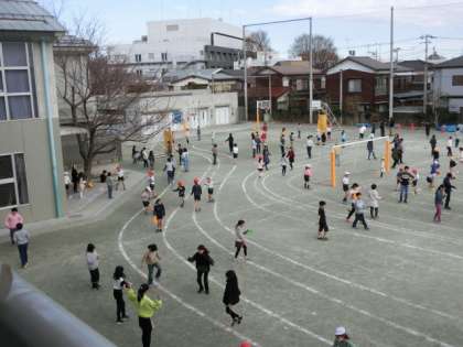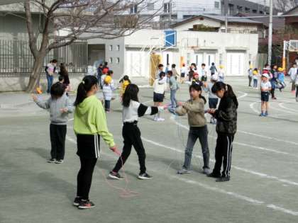 今日の金スポは、なわとびチャレンジ期間ということもあり、全校で短縄の練習を行いました。なかよし学級の班で、上級生は下級生に教えたり、先生も課題の検定をしてあげたりして、全校あげて体力作りに取り組みました。みんな一生懸命に取り組み、校庭は笑顔いっぱいで、とても活気がありました。
