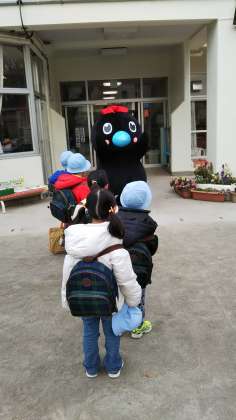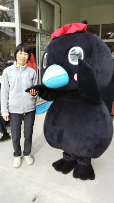 八幡山幼稚園の朝の挨拶に、烏山のキャラクター「からぴょん」が来てくれました。からぴょんは、ハシブトカラス小学校の1年生の女の子です。