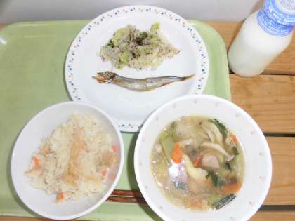 学校給食週間最終日は、歴史を意識した「焼きししゃも」と「すいとん」です。最近の給食のすいとんは、鶏卵入りの小麦粉団子に、スープには鶏肉が入っていたりと、とても美味しくできています。野菜がたっぷり摂れ、子どもたちの身体も温めてくれる1品です。