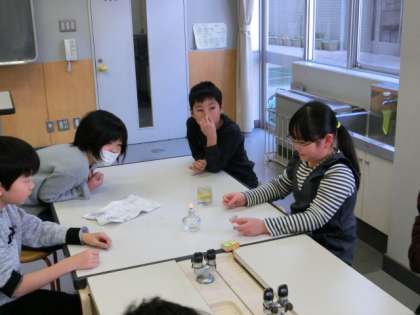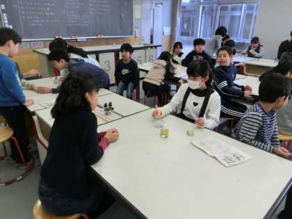 3組の1・2時間目は、理科室での実験です。「もののあたたまり方」の学習で、アルコールランプの使い方について実習を行いました。マッチをする機会も少なくなった子どもたちです。今回は、アルコールランプに火をつける練習と、火の消し方についても学びました。安全に気を配りながら、全員しっかりやり遂げることができました。