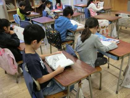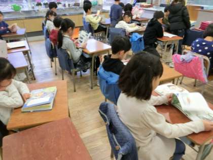 木曜日の朝は図書タイムです。1年生も大好きな本を静かに読んでいました。今週1週間は図書室が蔵書点検で使えないので、借りた本を既に読み終えてしまっている子もいたかもしれませんね。そんなときには、同じ本を繰り返し読んでみると、新たな発見があると思います。試してみてください。