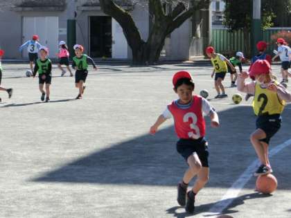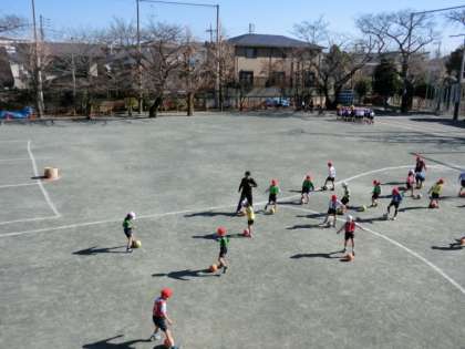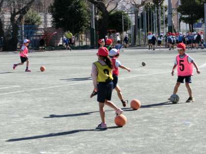同じ校庭では、2組も体育の授業で、ボールけり遊びの活動でした。足でボールをコントロールしながら、ドリブルの練習に励みます。冬晴れの暖かな日ざしの中、子どもたちは一生懸命にボールを追いかけていました。