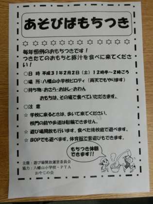 2月2日(土)、PTA遊び場開放運営委員会・おやじの会が主催する、「あそびばもちつき」が開催されます。12:30から受付が始まります。たくさんの参加をお待ちしています。