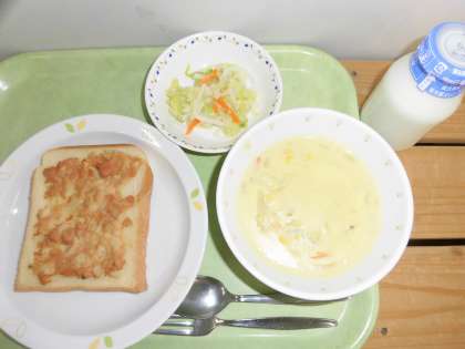 「ツナトースト、コーンチャウダー、大根サラダ、牛乳」です。