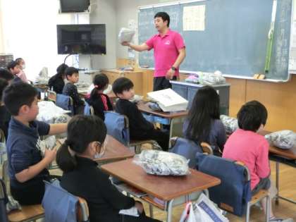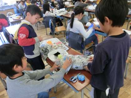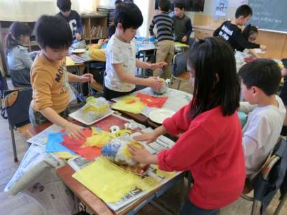 2組の午後の授業は、図工の時間。「かぶってへんしん」の課題で、新聞紙で型を作り、家から持ってきたいろいろなプラスティックの容器を使ってお面を作ります。目や耳をどこにつけるか、お花紙の色は何を使うか、創作意欲の旺盛な子どもたちは、どんどんイメージを膨らまして作業を進めます。どんな個性豊かなお面ができ上がるか、今からとても楽しみです。