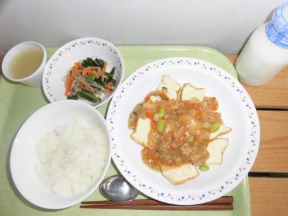 「ごはん、生揚げのそぼろあんかけ、野菜の辛子醤油かけ、りんごゼリー、牛乳」です。