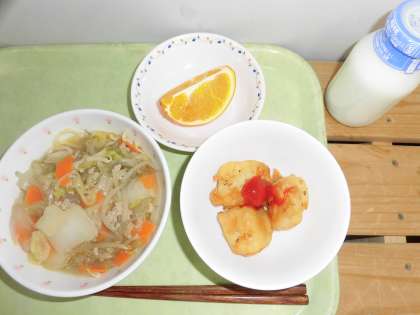 「味噌ラーメン、ポテトドッグ、ネーブル、牛乳」です。