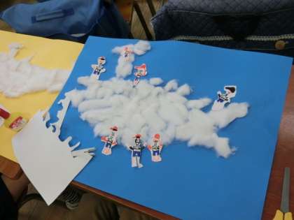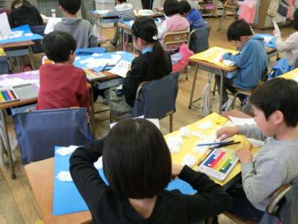 1組の図工の時間は、「くじらぐも」の学習。水色の色画用紙に、綿でクジラ雲を作り、その上に子どもたちを乗せます。お互いの作品を見合いながら、みんな一生懸命に作業していました。楽しそうに笑っている子どもたちが、雲の上で踊っているようで、とても夢のある作品に仕上がりそうです。
