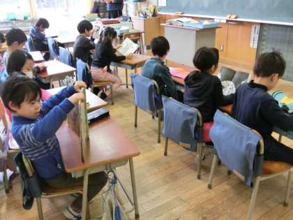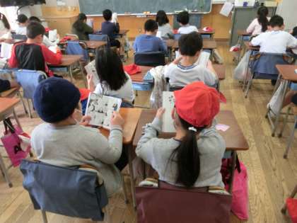 木曜日の朝は図書タイムです。1・2年生の教室では、自分の好きな本を静かに読んで過ごしていました。1年生も、少しずついろいろなジャンルの本に挑戦しているようです。