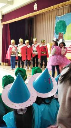 すみれ組の劇のストーリーです。木こりさんは、親切にしてあげたお礼に金のがちょうを手に入れました。皆が金のがちょうを触ろうとすると、なんと手がくっついてしまいます。そんな金のがちょうの行列が、生まれてから一度も笑ったことのないお姫様のいるお城の前にやってきました。