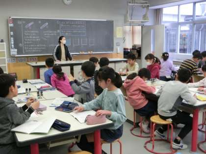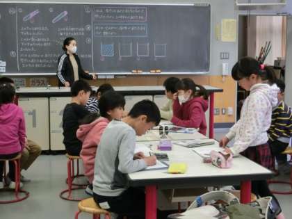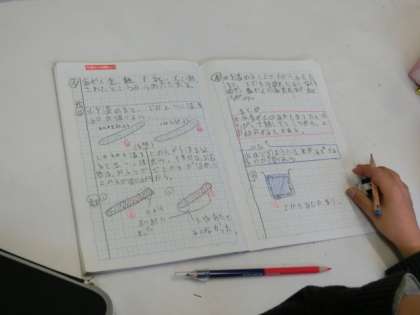 1組の5・6時間目は、理科室での理科の授業です。「もののあたたまり方」の学習で、水のあたたまり方を、金属の場合と比べて考察しました。ビーカーの中の水がどのようにあたたまるか、実験から分かったことをまとめ、それぞれの班ごとに発表していました。