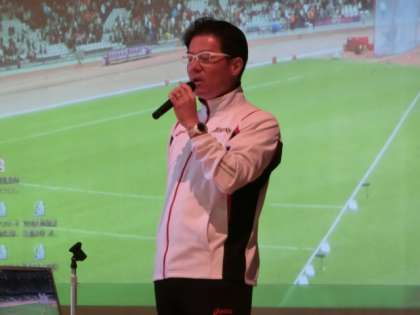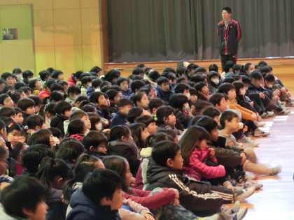 渡邉さんは、陸上の短距離の選手ですが、もともとはサッカーの選手だったそうで、講義の中では、学生時代のいろいろなエピソードを聞かせていただきました。さらに、海外の選手との交流や、今指導されている大学の陸上部のことなどのお話を通して、子どもたちには、「強い思い」をもつことが大事であることを教えてくれました。
