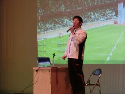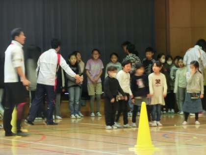 第1部の講演が終わり、休憩を挟んで、第2部の実技指導が行われました。今日は校庭が使えないため、引き続き体育館で行いました。