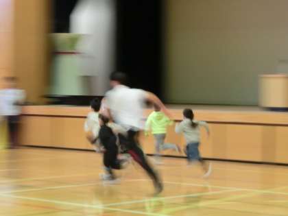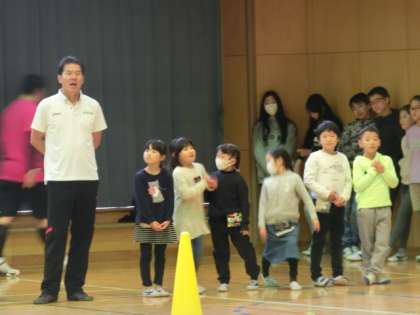 6年生から順番に、最後は1年生とハンデをつけての競走をしてもらいました。全校児童の声援を受けて、代表児童も懸命に走りますが、さすがオリンピアンの軽快で、きれいなフォームでの走りに、「ウォー!」という大歓声が上がりました。