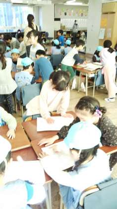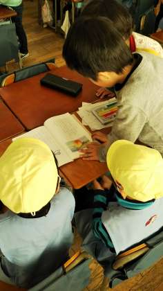 八幡山幼稚園の年長組が、八幡山小学校の1年生と交流をしました。1年生の教室で、筆箱や教科書を見せてもらうなどの学校生活を体験させて貰いました。