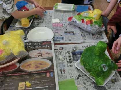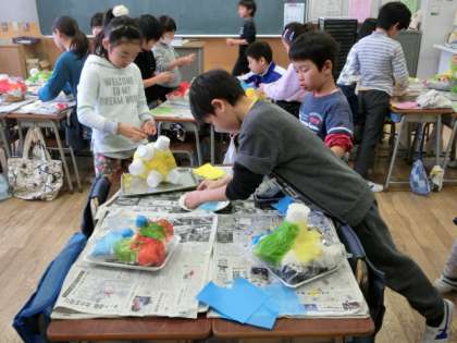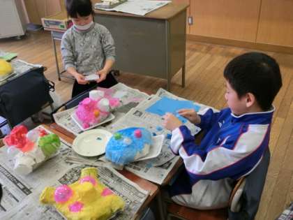 1組の図工の授業は、前回に引き続いて「かぶってへんしん」の課題です。新聞紙で型どり、いろいろなプラスティックの容器をつけて形作ったお面に、きれいなお花紙で色づけをします。色とりどりに貼っていく子や、一色で統一する子などそれぞれですが、みんな素敵なお面が仕上がってきて、笑顔いっぱいでした。