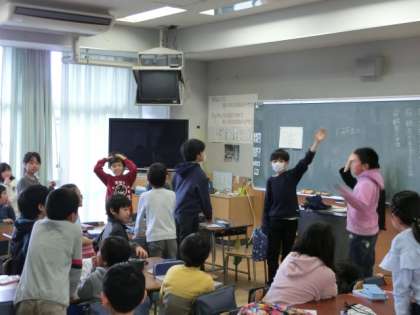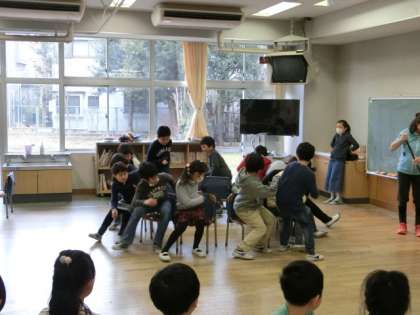 みんなで楽しく給食を食べた後、休み時間もなかよし学級で室内遊びをしました。イスとりゲームやフルーツバスケットなど、教室でできるどの学年でも楽しめる遊びをしました。1年生は、この1年やさしくお世話していただいた 6年生のお兄さんやお姉さんとの大事にしながら、みんな笑顔で活動に参加していました。