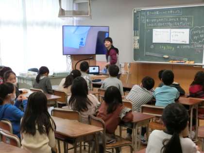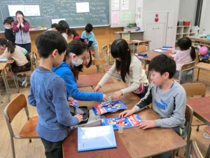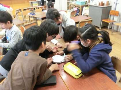 3年生の算数の授業は、「重さ」の単元の学習です。算数教室では、実際にはかりを使って100gの重さを体験しました。グループで相談しながら、ぴったりの重さになるように調整します。体験的な活動を通して、子どもたちは量的な感覚を養っていきます。