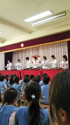 「ひなまつり」「小さな世界」「勇気100%」など、全5曲を綺麗な音色で、演奏してくださいました。子どもたちは、演奏と一緒に思わず歌ってしまいました。アンコールもあり、楽しい演奏でした。ベルフラワーの皆さんありがとうございました。