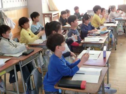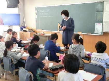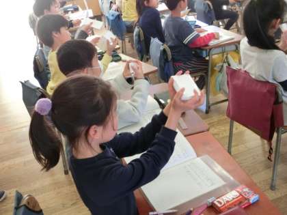 1組の4時間目は、算数の授業です。「はこの形」の学習で、組み立てた箱を展開して、気づいたことを発表しました。平面から立体、立体から平面に具体物を使って考えることで、図形への理解を深めることができます。子どもたちなりに気づいたことを発言することで、積極的に課題に向き合おうとする意識も育っているようでした。