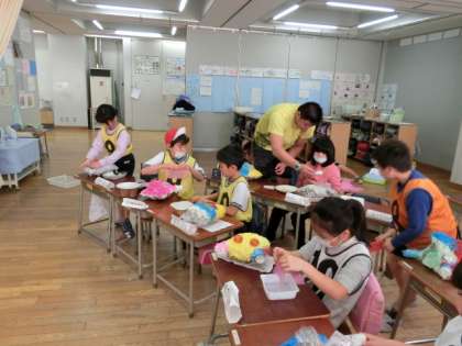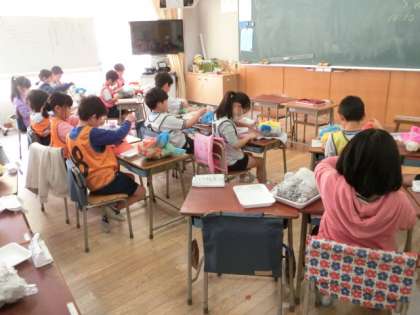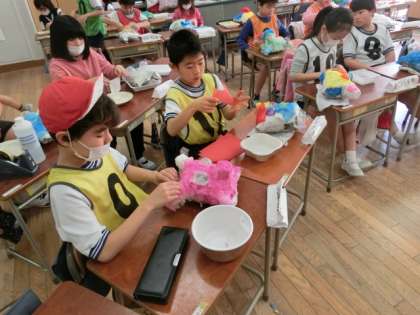 3組の1時間目の図工の授業は、「かぶってへんしん」の課題の仕上げです。いろいろな形に成形したお面に、お花紙をつけていきます。幾重にも重ねながら、きれいに仕上げようと、子どもたちはみんな真剣でした。糊が乾いたら完成です。楽しみですね。