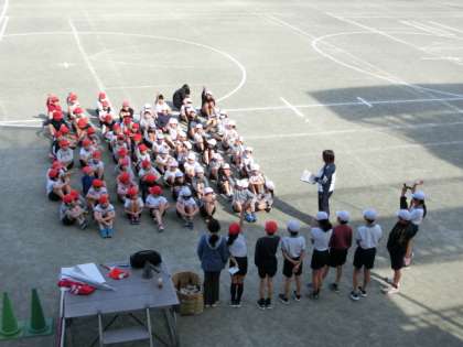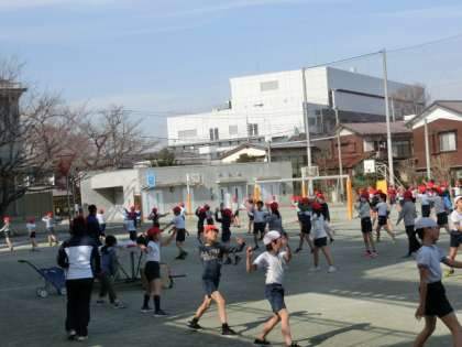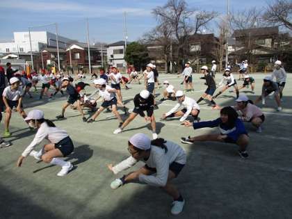 午後5・6校時、毎年恒例になっているお別れスポーツ大会が、冬晴れの校庭で行われました。5年生は、卒業を控える6年生との親睦を深めると同時に、お世話になった感謝の気持ちを伝え、後を引き継いていくという覚悟をもって6年生に挑みます。今回も、5年生が中心になって企画しました。まずは、それぞれ4年生の時に踊った「ソーラン節」で準備運動を行いました。