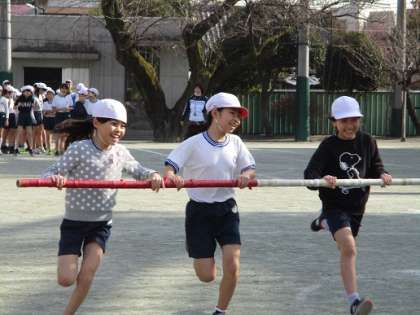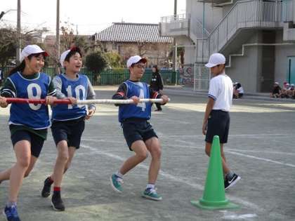 続いて、3年生の時に行った「台風の目」が行われました。この競技は、チームワークが鍵を握ります。仲間同士声をかけ合いながら、必死に走る姿がとても清々しく見えました。