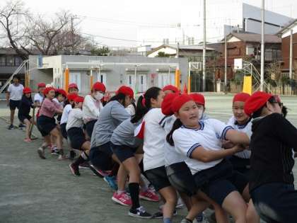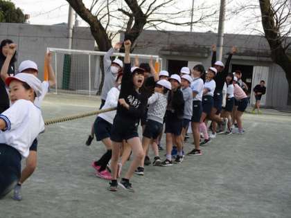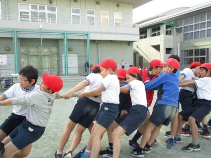 最後の競技は、「全力綱引き」です。5・6年生が赤白に分かれて戦いました。大きなかけ声とともに、全員の力を集結して懸命に引きます。勝敗以上に、学年の垣根を越えた絆の深まりが感じられ、子どもたちはみんな達成感でいっぱいの表情でした。