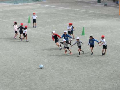 2年生は、プロのサッカーチームの講師をお迎えしてサッカー教室を行いました。ボールを使った簡単なウォーミングアップから始まり、最後はゲーム形式で楽しくサッカーを楽しみました。男子も女子も楽しんでサッカーに親しめるように、いろいろと工夫された練習の仕方に、先生方も勉強になったようです。講師の先生方、遠方よりお越しいただき、子どもたちに楽しい授業をありがとうございました。
