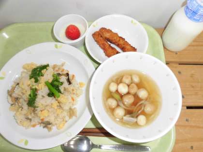 「菜の花ずし、いかのかりんと揚げ、すまし汁、ヨーグルトゼリー、牛乳」です。