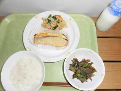 「ごはん、鮭の梅マヨネーズ焼き、野菜のおかかかけ、茎わかめの金平煮、牛乳」です。